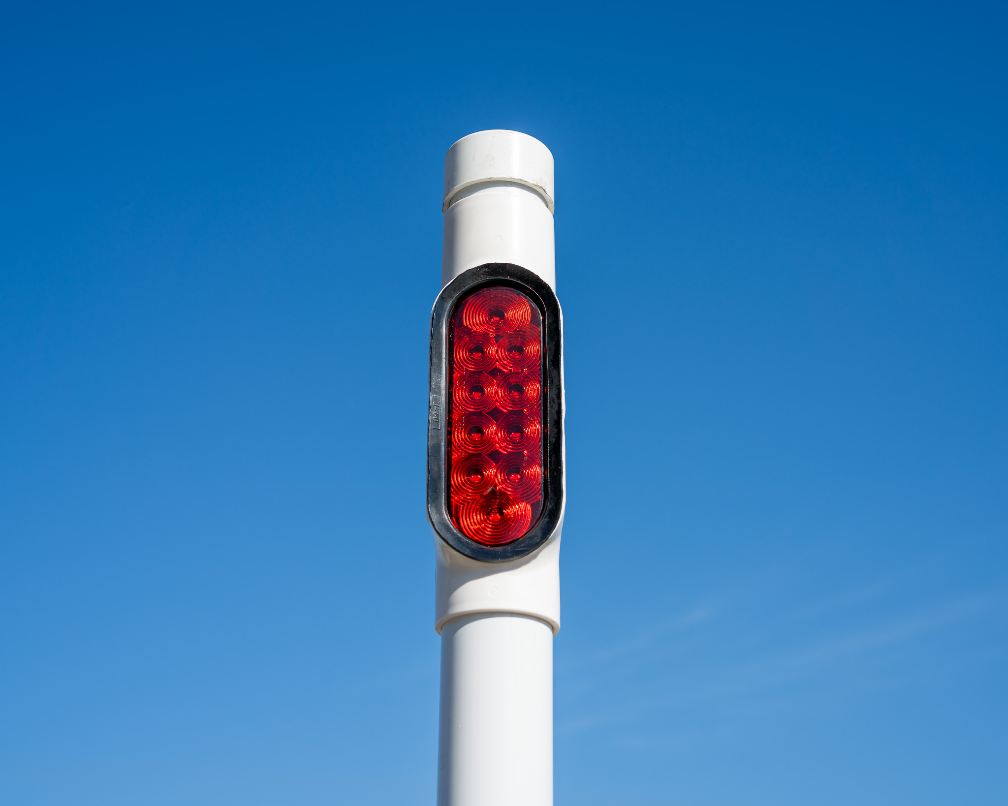Elevated tail lights mounted on guide poles to improve visibility, protect lighting from water damage, and enhance safety on the road.