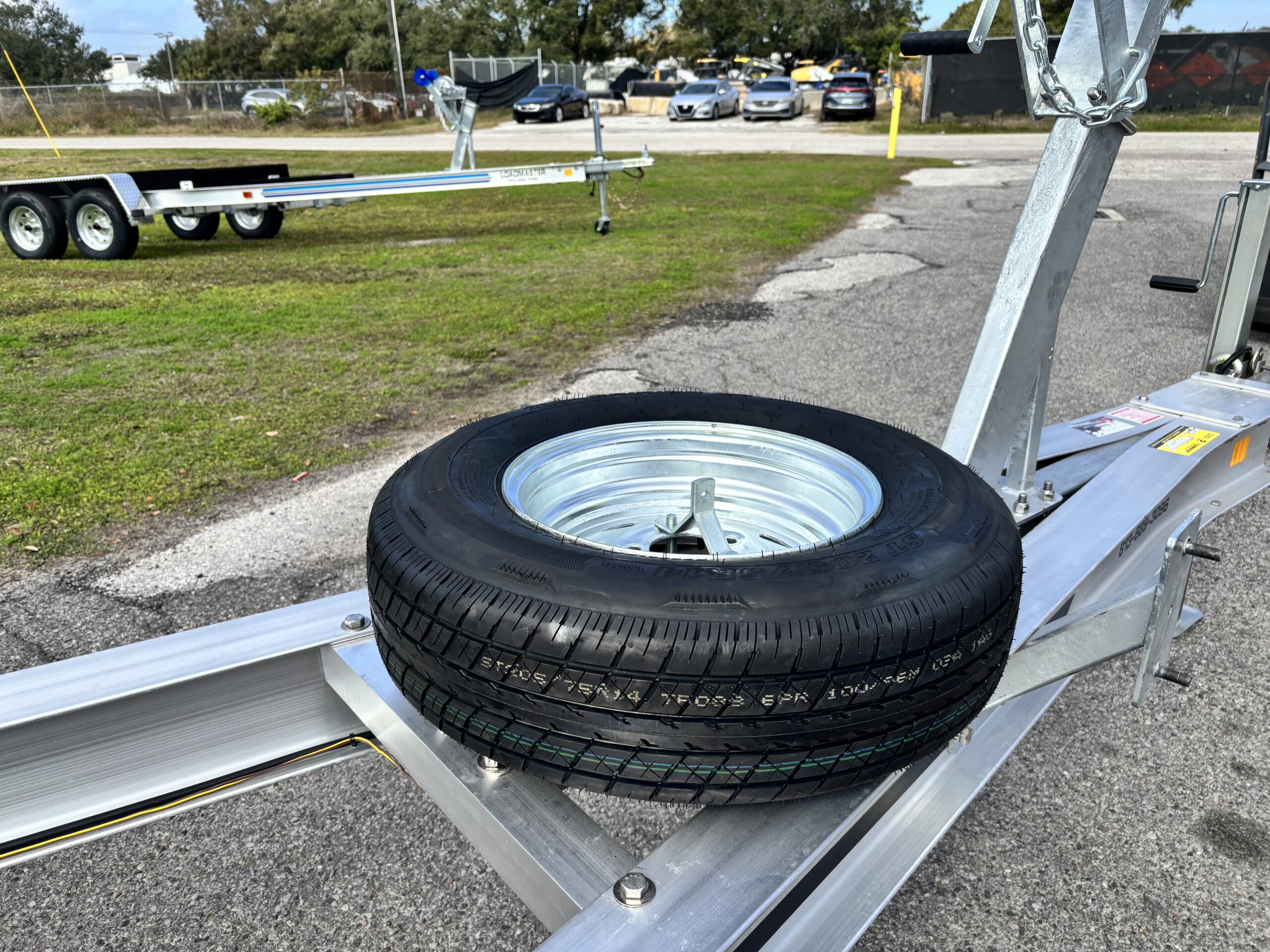 A complete spare tire solution mounted securely to the trailer frame for quick access and peace of mind on the road.